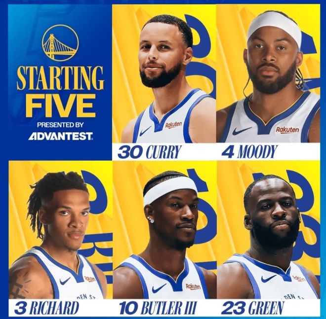 賽前,美媒ESPN預測本場比賽的實時勝率,勇士勝率僅有37.7%,馬刺隊勝率則高達62.3%,差異明顯。今天比賽,首發陣容方面,勇士隊這邊,庫里背靠背繼續帶病出戰,科爾臨時變陣排出的最新首發五人組為:斯蒂芬-庫里、摩西-穆迪、威爾-理查德、吉米-巴特勒和德雷蒙德-格林;馬刺隊這邊,首發陣容則為:達龍-福克斯、斯蒂芬-卡斯爾、德文-瓦塞爾、哈里森-巴恩斯和維克托-文班亞馬。